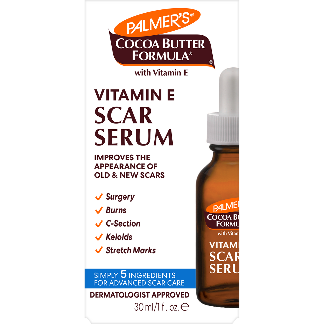 Contains the ingredients most recommended by doctors. Palmer's Cocoa Butter Formula Vitamin E Scar Serum combines five powerful ingredients to reduce the appearance of scars resulting from surgery, injury, burns, stretch marks, C-section, cuts, scrapes, and insect bites.